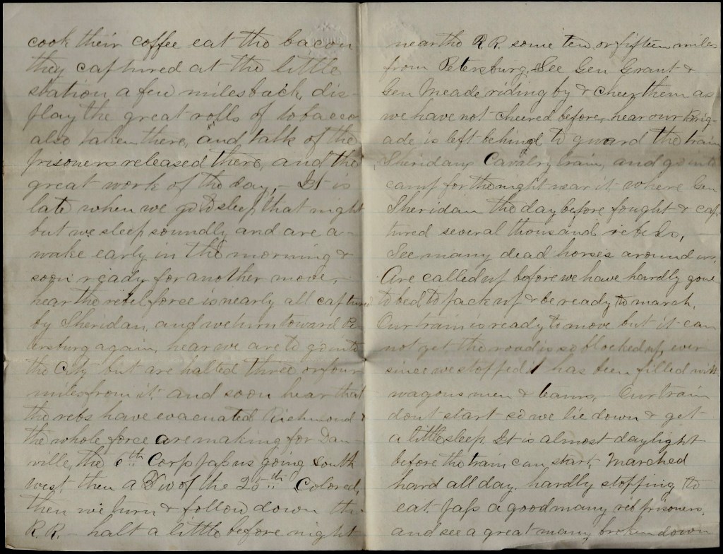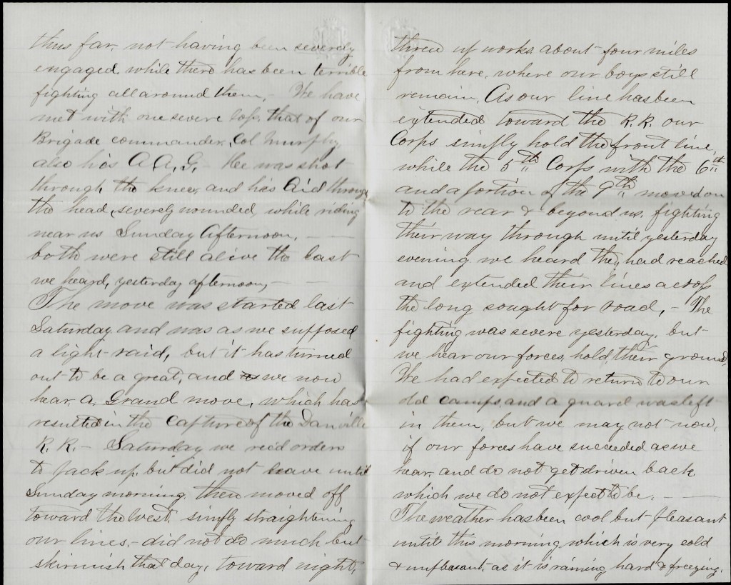 The move was started last Saturday and was as we supposed a light raid, but it has turned out to be a great, and we now hear, a Grand move, which has resulted in the capture of the Danville Railroad. Saturday we received orders to pack up but did not leave util Sunday morning, then moved off toward the west, simply straightening our lines. Did not do much but skirmish that day. Toward night, threw up breastworks about four miles from here where our boys still remain. As our line has been extended toward the railroad, our Corps simply hold the front line while the 5th Corps with the 6th and a portion of the 9th moved on to the rear & beyond us, fighting their way through until yesterday evening we heard they had reached and extended their lines across the long sought after road.
