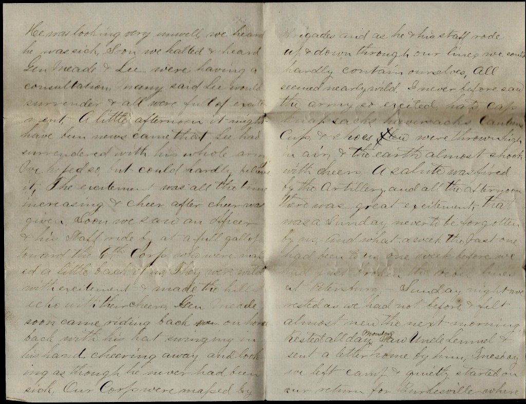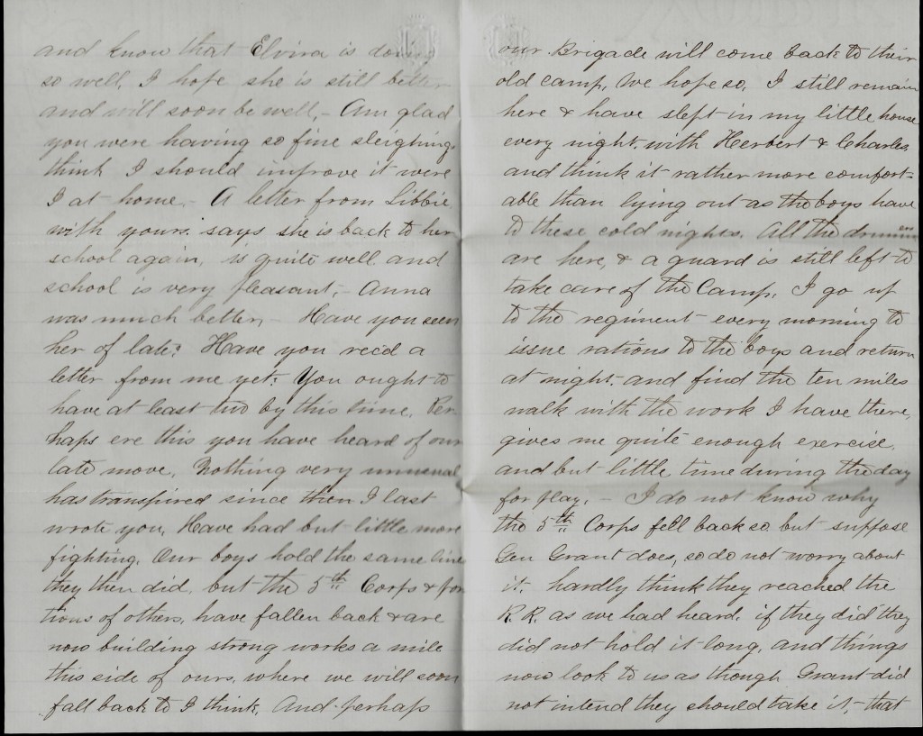 Did I tell you the 6th Corps were with us again? They came a few days ago and day before yesterday Uncle Lemuel came to see me. He is looking very rugged and healthy. Said he was very glad to see me looking so well. Thought I stood being “in the field” well. My health is still excellent, was never better, I think, for which I am very thankful. I have just about enough to do of late to keep me hale & hearty but I am not quite as fleshy as I was two winters ago.