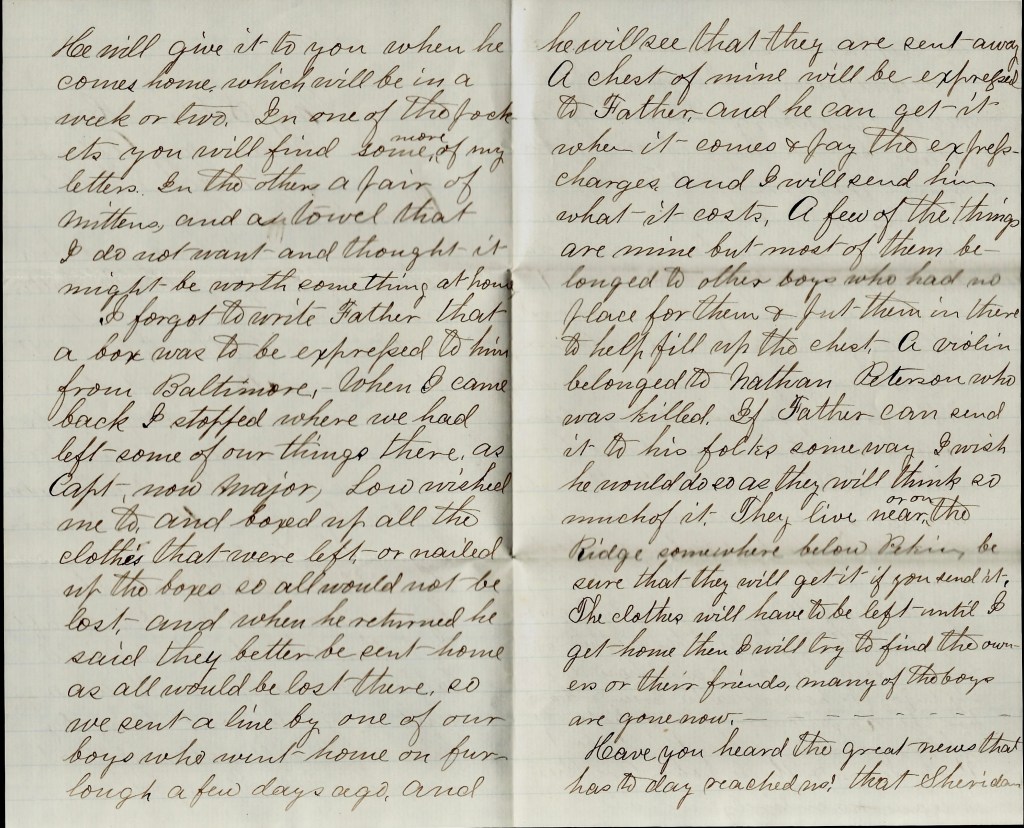 You wrote for Charles’ things—his coat that was left here, but just before the regiment [left] that morning, the company was sent here to get their dress coats & hats. There was no hats left here but was some coats. But in Charles’ knapsack there was only one coat and one pair of pants. And in the little box there was nothing but straps and brasses and the Captain took them when he come here about 5 weeks ago. The coat & pants was the only kind of clothing they had here unless packed with some other mens for I can’t find any marked with Charles’ nor other name so I don’t know. But if you learn there is any amongst the others, you will surely get them. What there was I sent to Mrs. Smith but have not heard from her since I sent them.