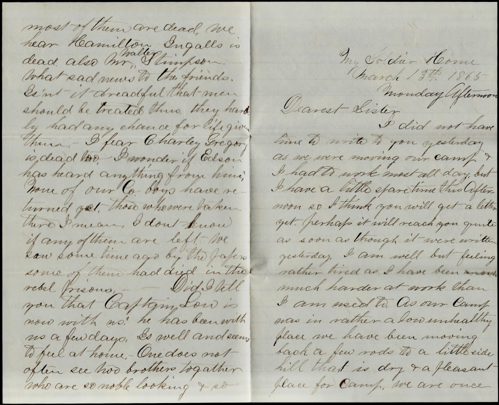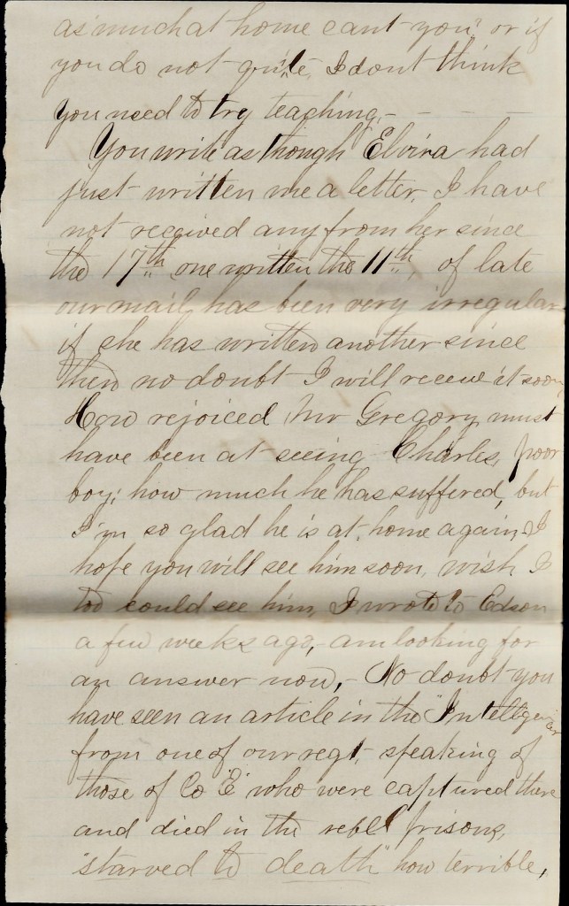 Eugene had one letter for me, one from Mr. Gregory and a good long one it was too. Mr. Gregory writes very patriotic and seems very hopeful of a speedy overthrow of rebellion and an end to war and slavery. Said they could hear nothing of Charles. I fear Charles has been sent south. Hope he may be spared to return to his home and friends. But how very much the boys have to suffer. It is terrible to think prisoners should be treated so. The South will be well paid for such cruelty. How can they even hope for any success? I had expected another letter or two but suppose I will hear from you and Libbie again by tomorrow. Are you all well? Have you heard from Harvey and Elvira of late? Did I tell you I had received a letter from her since she returned to her school? She was quite well and the school seemed as pleasant, or more pleasant, than ever. The teachers were so good and the scholars so kind. All seemed so glad to see her again. Am glad she finds it so pleasant.