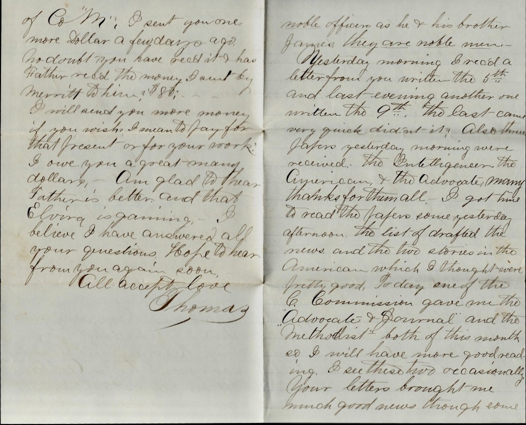 You say Clark would like to borrow some money of me. I would like to accommodate him, but cannot send any money home just now as I have lent most of what I had to the boys here until pay day. I don’t know when we will be paid again. I fear not until after New Years. Much love to you and all, — Thomas