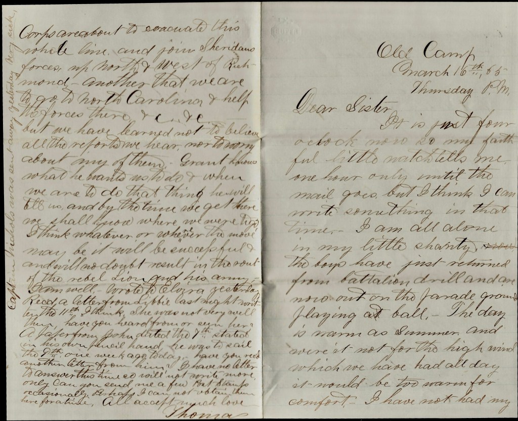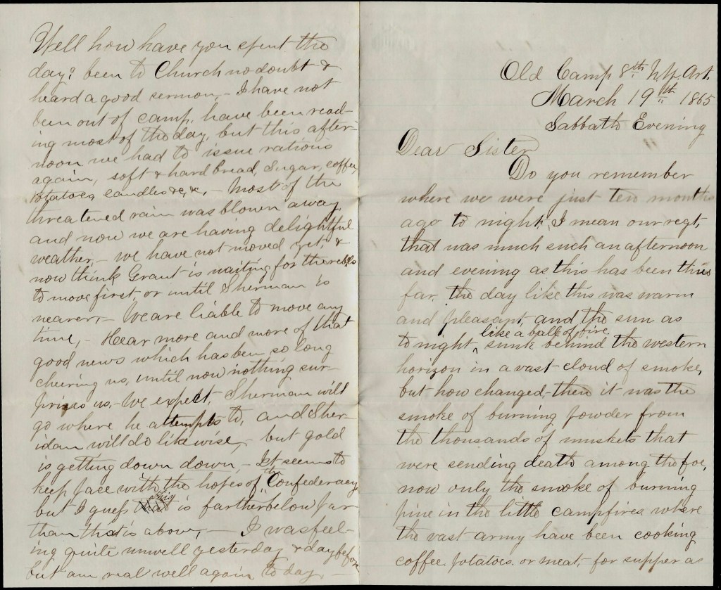 Our boys are still doing picket duty. Last night one Johnnie came into the lines where one of our boys were. A great many are deserting of late. Some come into our lines ever night. Night before last, they say two companies came in. I do not wonder they feel as though their cause was hopeless. Wish all might lay down their arms. We do not hear much news of late. They say Sherman is going to do something great soon. We don’t know what it is. I think our army here were just on the eve of some great move when this late storm commenced. Now it will be delayed some time.