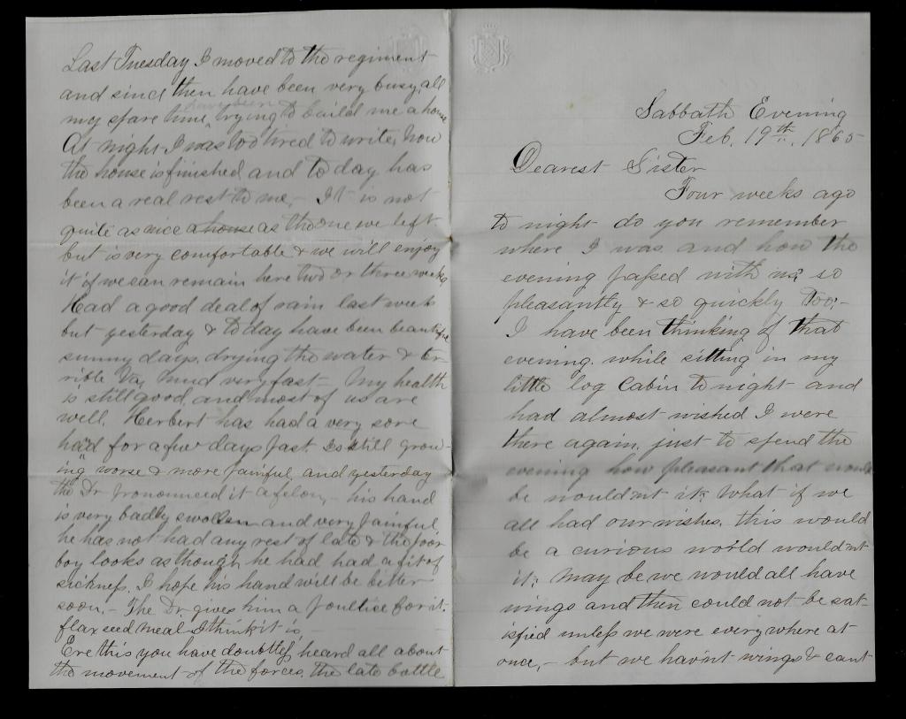 Well, how do you all do tonight? Is Elvira better? Does she sit up more than she did? …Her soldier brother was not very kind. I fear that he did not take her out once while he was at home but tell her he is sorry he was so naughty. She must forgive him this time and he will try and do better…How is the sleighing now? The air is a little warmer here, they say, than while I was at home. Today has been clear and so pleasant. Was ever such a day seen North? How good that we are here instead of in the cold, northern clime. The morning was cold and frosty so we needed our overcoats & mittens when we drew rations early this morning, but at noon the cold & frost has gone and we hardly needed any coat or even a fire to keep us comfortable. How different from home. No snow here and scarce any mud just now. All day the dust flies almost as the snow does at home.