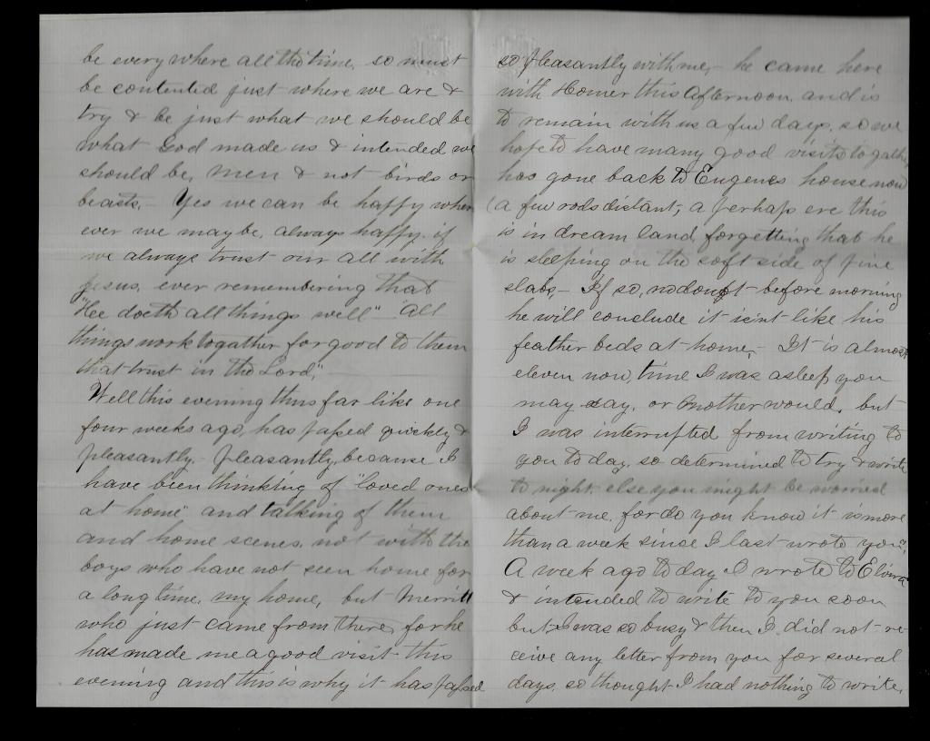 Received a short letter of the 17th yesterday morning; also one from Libbie. She has the Mapleton school, she tells me. I hope she will not have to work so hard this winter. How is Father> Id his health still improving? Has Elvira become tired of talking to you, telling you of her school and so many things which you would like to hear about? I wish I might listen to her conversation a while too. But she will have to talk on paper to me. Hope she will find time to write me a long letter. I haven’t heard from John is some time. I am looking for a letter from him. Has he been home of late?