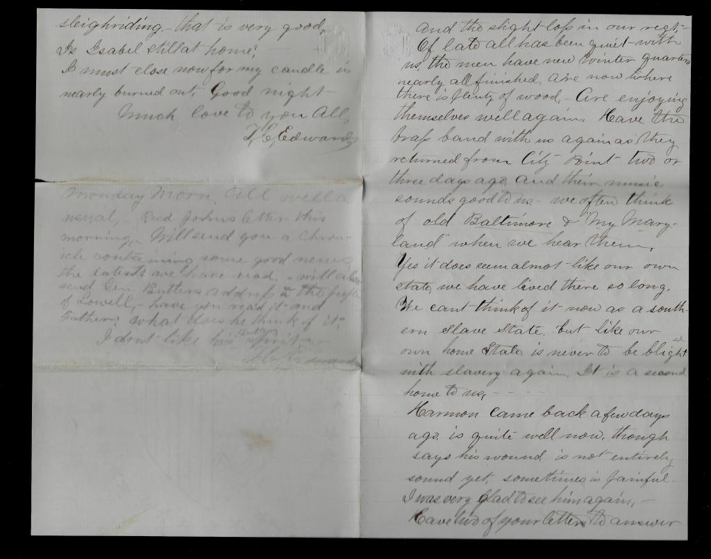 How is the sleighing now? Me thinks if you have snow these moonlight evenings of late are pleasant for sleigh rides, but you haven’t anyone to take you have you? Perhaps we can make up for them next winter however. I suppose Libbie went into her school again Monday last. Have you seen her of late? Did she make you the promised visit? I received a good letter too from her last Monday. She said they were all going over to our house the next day and she guessed you would have a house full. I thought while I was reading it there might have been room for me too. And I guessed you would have been glad to see me. How pleasant if I could have been there, but perhaps it is just as well. Maybe I can come home some other time when it will be just as pleasant. I hope I shall not be so disappointed of a furlough again. They will be granting them again by & by, I presume. I shall try once more for one.