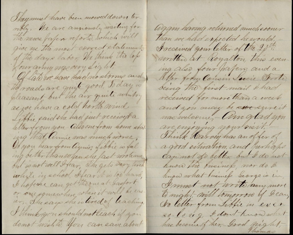 I am not particular about your sending me every Baltimore paper for we have the Washington paper nearly every day. Now I think I have written you quite a letter and as it is quite late, I must bid you good night. With love to you all and a kiss for you. I am your loving brother, — Thomas