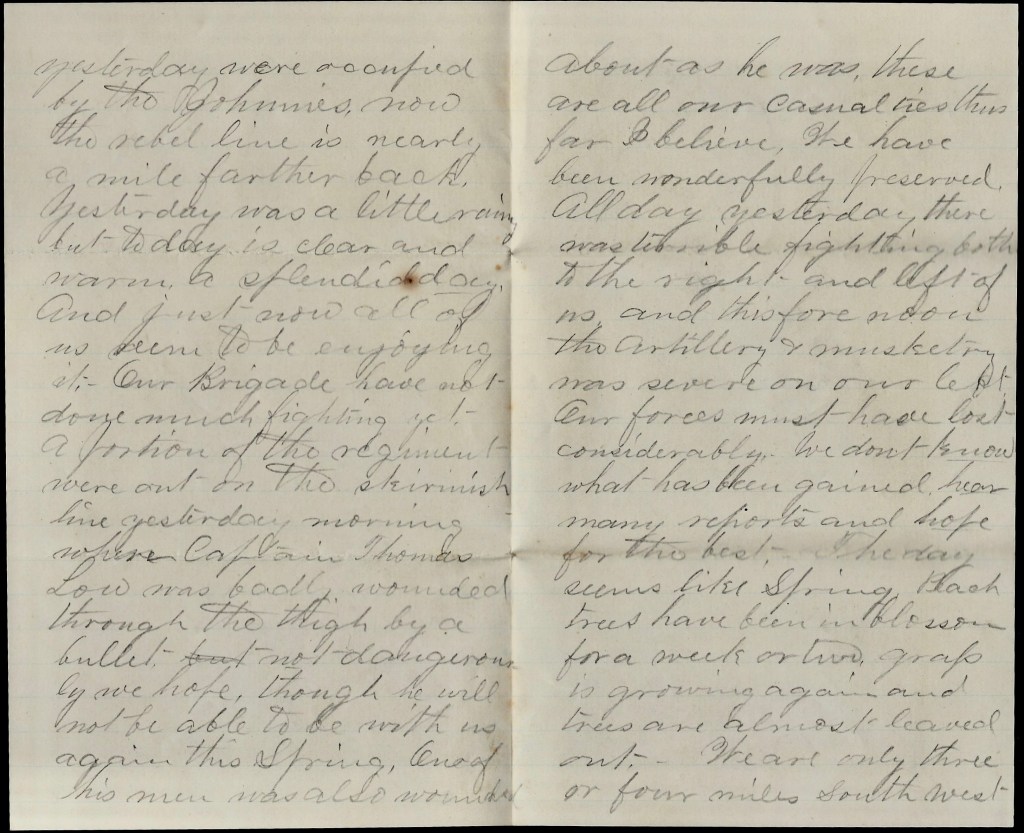 Our forces have been moving again so I am a little behind my usual time of writing and I don’t know when I can mail this but I will improve the few minutes of spare time I now have that you may know how we are. I am still save and well All of our regiment were safe when I left them last night though they have seen some fighting since Sunday morning, or all except two who were slightly wounded—one of Co. F and one of Co. H. Our Brigade have been wonderfully preserved this far, not having been severely engaged while there has been terrible fighting all around them. We have met with one severe loss—that of our Brigade Commander, Col. Murphy. Also his A. A. G. He was shot through the knee and his Aide through the head, severely wounded, while riding near us Sunday afternoon. Both were still alive the last we heard yesterday afternoon.