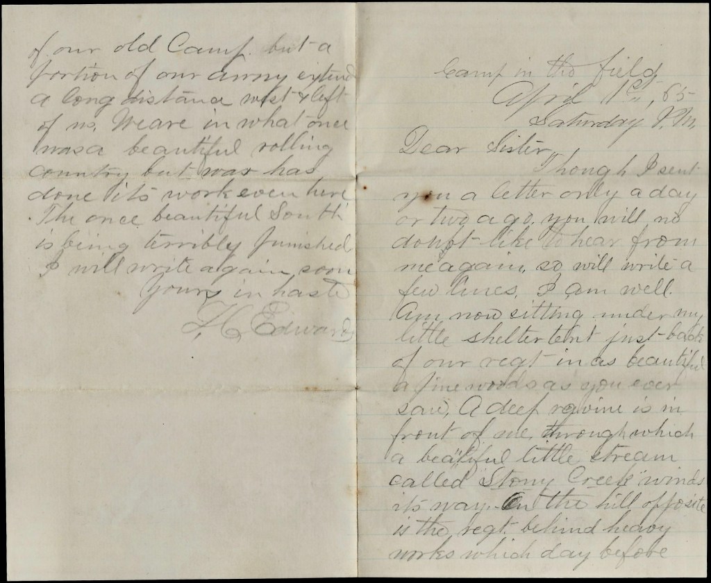 We still have to do picket duty a portion of the regiment at a time—three or four from each company each day—so the duty is not severe. All is quiet along our lines of late. We hear of no great movement. Sunday morning we heard heavy cannonading in the direction of Petersburg and heard it was a salute fired for the capture of Savannah, but cannot learn yet that that has been captured. Hope it has. All the news we do hear seems to be so good and encouraging. I hope our forces may still continue successful and the rebellion can’t last very much longer. Do you have any more sleigh rides? Have you seen Libbie of late? The sleigh ride with you all a week ago would have been pleasant. What has become of Lucy? No letter from her in a long, long time, nor Dellie either. Tell them to write. Remember me kindly to all the friends. Ever your loving brother, — T. C. Edwards