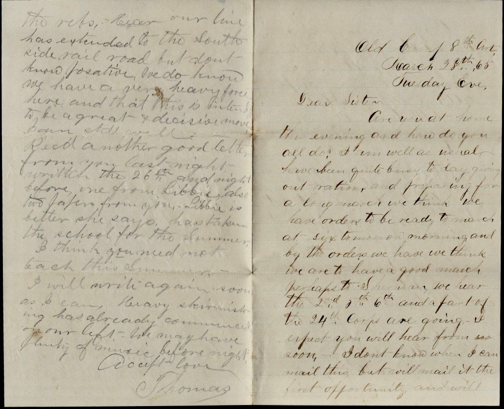 As yet we hear but little from them. Some say they were to move on the Danville Railroad while others think they have gone south and have already cut all communication in their rear. Perhaps you will have learned by the papers all about the movement ere this reaches you. This evening the 1st & 3rd Divisions of the 6th Corps passed us going farther to the left. We expect to hear great news soon—news that will come with a crash on the whole South and tell the world that General Grant is in earnest in putting down rebellion. We hope & pray this great move may not only end this terrible campaign but end this cruel war also. Oh may our Heavenly Father give us a great victory this time also, that peace and prosperity may speedily be restored to our bleeding, suffering country.