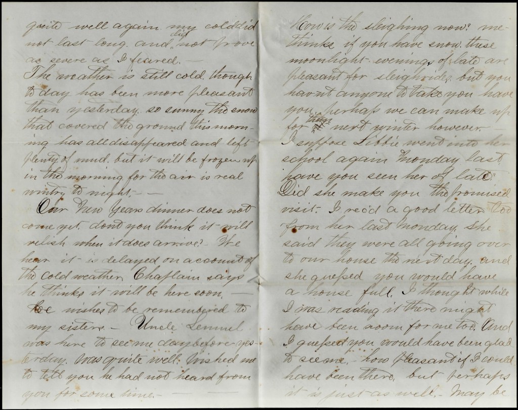 Our New Years dinner does not come yet. Don’t you think it will relish when it does arrive? We hear it is delayed on account of the cold weather. Chaplain says he thinks it will be here soon. He wishes to be remembered to my sister. Uncle Lemuel was here to see me day before yesterday. Was quite well. Wished me to tell you he had not heard from you for some time.