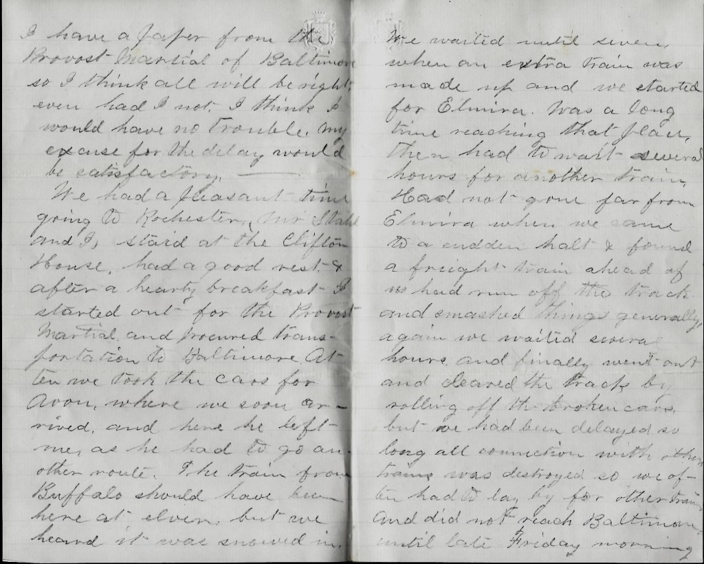 We had a pleasant time going to Rochester. Mr. Stahl and I staid at the Clifton House. Had a good rest and after a heart breakfast I started out for the Provost Martial and procured transportation to Baltimore. At ten we took the cars for Avon where we soon arrived, and here he left me, as he had to go on another route. the train from Buffalo should have been here at eleven but we heard it was snowed in. We waited until seven when an extra train was made up and we started for Elmira. Was a long time reaching that place. Then had to wait several hours for another train. Had not gone far from Elmira when we came to a sudden halt and found a freight train ahead of us had run off the track and smashed things generally. Again we waited several hours and finally went out and cleared the track by rolling off the broken cars but we had been delayed so long all connection with other trans was destroyed so we often had to lay by for other trains and dd not reach Baltimore until late Friday morning.