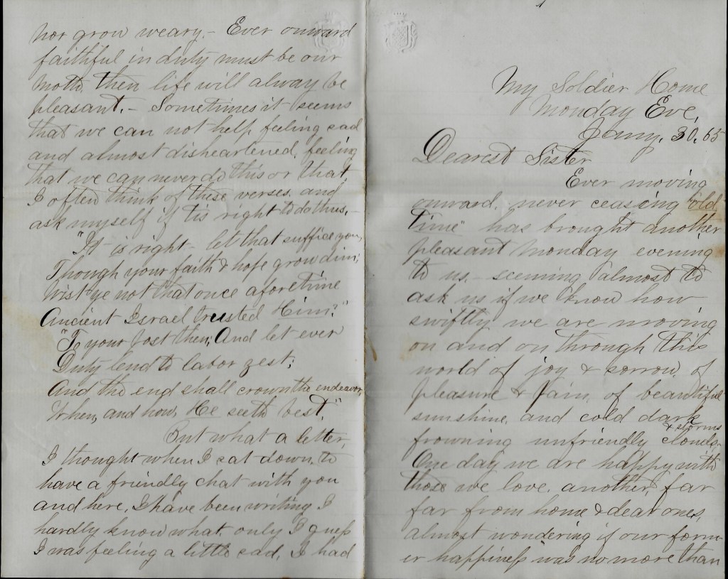 I received a letter from you this morning which was perused as usual with great interest and pleasure. A letter from loved ones at home; do you know how we prize one? Oh what would we do without them. They are the links that bind us to that home and often I think keep the absent soldier from straying from the path of right and truth. How cheering to know “They think of me at home.” Oh how strong we feel when we know the loved ones at home are praying for us. Yes, we feel stronger to battle on, trusting all with Jesus who has promised to “be with us always.” I also received a letter from Libbie and one from John. Am glad Father’s health is improving. Hope he will soon be well.