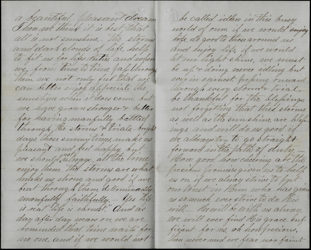 Ever moving onward, never ceasing old time has brought another pleasant Monday evening to us, seeming almost to ask us if we know how swiftly we are moving on and on through this world of joy & sorrow of pleasure & pain, of beautiful sunshine, and cold dark frowning unfriendly clouds & storms. One day we are happy with those we love, another, far far from home & dear ones, almost wondering if our former happiness was no more than a beautiful, pleasant dream. Then we think it is best that all is not sunshine. The storms and dark clouds of life help to fit us for life’s duties, and when we from time to time pass through them, we not only feel that we can better enjoy, appreciate the sunshine when it does come. But we have grown stronger & better for having manfully battled through the storms & trials…