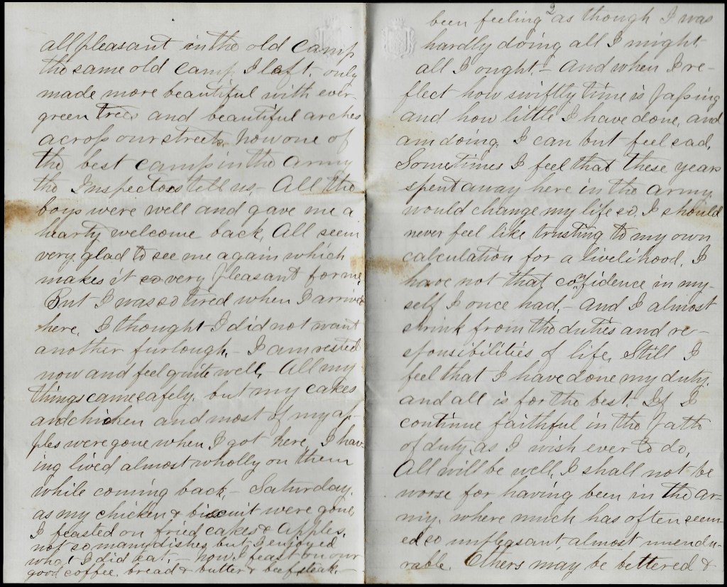 I feel that these years spent away here in the army would change y life so I should never feel like trusting to my own calculation for a livelihood. I have not that confidence in myself I once had and I almost shrink from the duties adn responsibilities of life. Still I feel that I have done my duty and all is for the best. If I continue faithful in the path of duty, as I wish ever to do, all will be well. I shall not be worse for having been in the army where much has often seemed so unpleasant, almost unendurable. Others may be bettered & I shall be better myself He who has blessed and kept me thus far will bless & keep me still, and I shall not be worse, nor in ought be a loser by having tried to do my duty now, by leaving home and business to help save our country.
