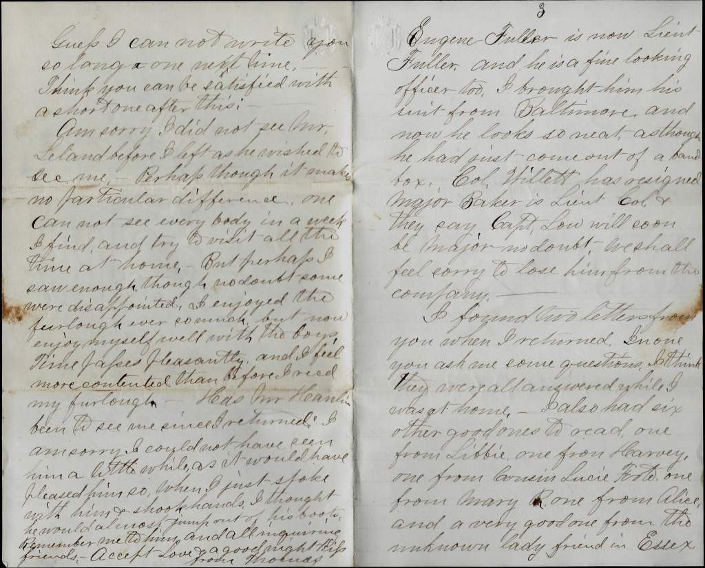Eugene Fuller is now Lieut. Fuller and he is a fine-looking officer too. I brought him his suit from Baltimore and now he looks so neat, as though he had just come out of a band box. Col. Willett has resigned. Major Baker is Lieutenant-Colonel & they say Capt. Low will soon be Major, no doubt. We shall feel sorry to lose him from the company.