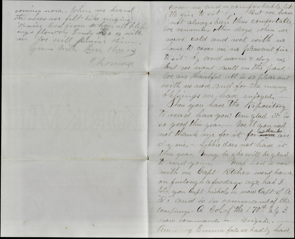 Today is warm and cloudy. Was a little rainy last night. I am feeling must better than yesterday. Quite well today. Orrin Babcock has just started for home—Michigan, on a twenty day furlough. Never had had one and as a few furloughs were being granted, he applied for one a few days ago and it came around much sooner than he had expected. He will have a fine time. This will be a great day in York State. We are very hopeful of the results that not only our own state, but the whole of the Northern States will show to the world that they are for truth and justice. With love to all, I remain as ever, — Thomas