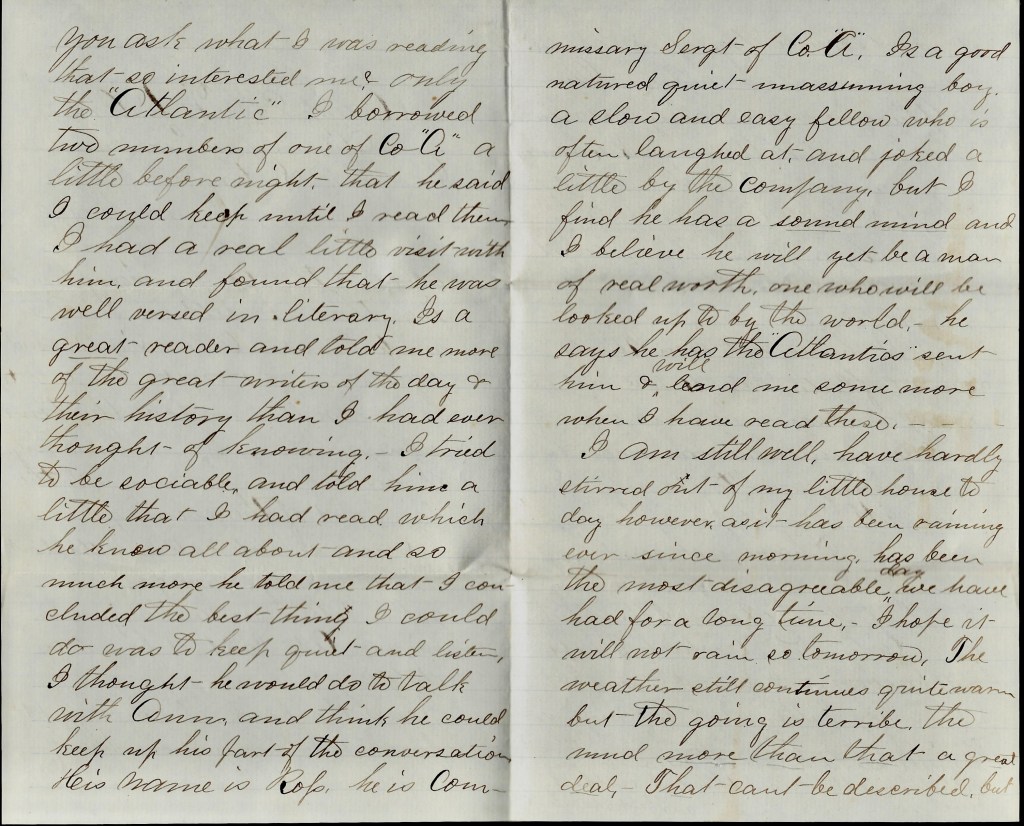 Of late it is delightful here, like Indian Summer again, and is as warm this evening. We scarcely need a fire to keep ourselves comfortable. I am still in the little house Herbert and I went into the other day. Am some distance from the regiment now as they have moved again but we expect to move near them tomorrow. You see I remain near the commissary tent now and do not have to move every time the regiment does. But I like to be near them where I can see the boys often. Have I told you who Herbert is? Then I will do so. He is brother to one whose place I have taken, and is detailed to help with the Commissary Department now. He helps me and we are keeping house together. He used to live near Medina, I think. Is quite young but a very steady boy and excellent company. Is a great reader withal, and all the evening he has been reading the papers. I received the [Christian] Advocate & Intelligencer. Seems to like them much. He has several papers & magazines set him so I will have more good reading now. He often has the Atlantic Monthly among others, and now has the Novermber number, but I have been so busy this far I have only had time to look it through. After we get moved & settled if we do not have to move again soon, I hope to have more time for reading & writing. Now I have no company duties to do.
