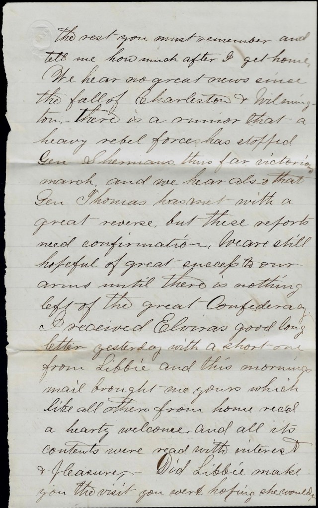 Well, what think you of Sherman’s great victory in the capture of Savannah? Pretty good, isn’t it? It seems as though he was sweeping everything before him. And Hood’s wonderful army that was going to do so much out West is nearly destroyed. Everything seems encouraging for the Union cause.