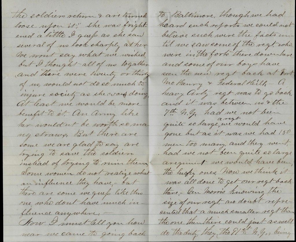 Something like a week ago, our company took some Rebel prisoners from the depot to Fort McHenry & while we were marching them through the streets of the city, we heard many words of sympathy from the brave females here. How they pitied the poor prisoners. One lady gave a hurrah for Jeff Davis & I never wanted to shoot anyone so much in my life. Would it have been wicked if I had? I don’t believe it would have been. But I must tell you how some of our boys chuckled over the kindness of these friends. Several boxes of cigars were given to one of our sergeants to distribute among the prisoners & he thinking our boys knew how to smoke as well as they, distributed most of them among us, & for several days our boys would testify to the excellency of these cigars. I might have had some too had I wished but as I don’t smoke, I don’t know how good they were so the boys tell me.
