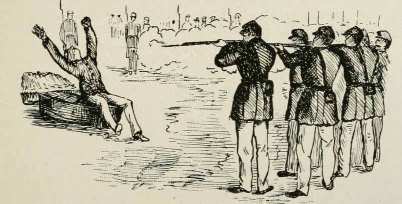 That morning we were called out to see a man shot. It was a very sad day to us and we do not care to see another such sight. The prisoner was a member of the 184th Pennsylvania 1 and was shot for desertion, or attempted desertion and exposing to the enemy our strength and plans. Our whole Division were out and formed in a square in a large field. He was brought up in a wagon, sitting on his coffin and was driven around the square while a band played the death march. He was then taken to the grave near the center of the field and sat upon his coffin blindfolded while twelve muskets were aimed at his heart. As they fired he fell dead but the scene was too terrible to witness and many strong men—men who had braved many battles, men who had stood firm while the bullets whizzed around them cutting down their fellows on their right and left—were now overcome by the sight and as the guns flashed and the poor victim fell, they fainted and fell as if they too had been shot. Though the sight was sad. we believe it will have a good effect upon all who witnessed it, for we doubt if any who witnessed it would now wish to desert.