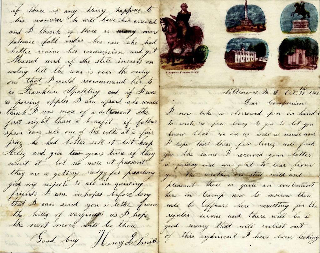 This letter was written by Henry L. Smith (1833-1864) of Hartland, Niagara county, New York. He enlisted on 4 August 1862 at Lockport, New York, as a private in Co. D, 129th New York Infantry. On the very day that Henry wrote this letter, the regiment was designated the 8th New York Heavy Artillery. He served in the defenses at Baltimore until 1864 when his regiment was sent to the Virginia battlefront and used as infantrymen. He was seriously wounded in the Battle of Cold Harbor on 3 June and died of his wounds on 16 June 1864 at Lincoln General Hospital in Washington D. C.