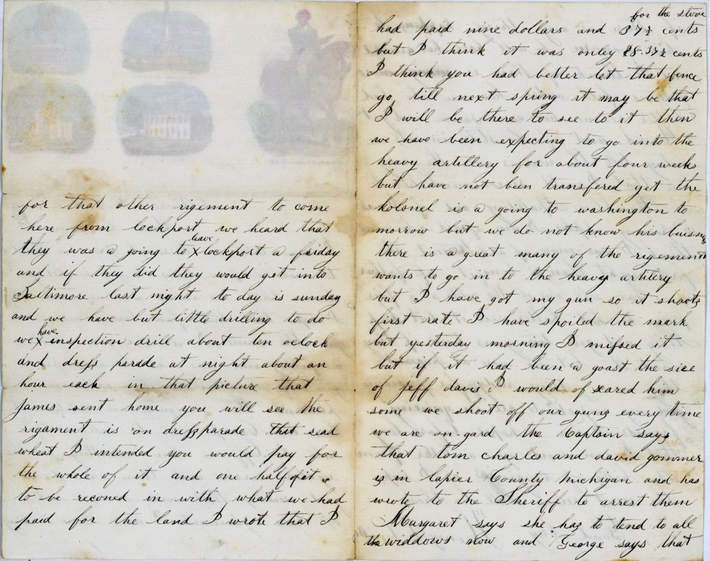 We have been expecting to go into the heavy artillery for about four weeks but have not been transferred yet. The Colonel is a going to Washington tomorrow but we do not know his business. There is a great many of the regiment wants to go into the heavy artillery but I have got my gun so it shoots first rate. I have spoiled the mark but yesterday morning I missed it. But if it had been a ghost the size of Jeff Davis, I would of scared him some. We shoot off our guns every time we are on guard. The Captain says that Tom Charles and David [D.] Ganmer is in Lapeer county, Michigan, and he has wrote to the sheriff to arrest them.