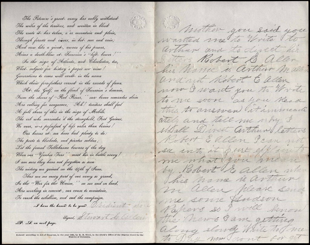 The letter was a pre-formatted letter, written in prose, enabling the soldier to merely fill in a few blanks and then add a personal note as a post script. Stewart’s post script begs his mother to explain why he should address letters to his younger brother (Arthur M. Allen, b. 1845) by some name other than his given name. Apparently he was operating under an alias for some reason.
