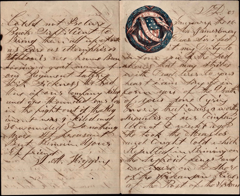 This letter was written by James M. Higgins (1835-1863) of Co. H, 96th Ohio Volunteer Infantry. He wrote the letter to James Emery (1818-1888) of Bellfontaine, Logan county, Ohio, regarding the death of his son, Cyrus Eagle Emery, who enlisted when he was 19 years old on 8 August 1862 to serve in Co. H, 96th Ohio. We learn from the letter that Cyrus died on a hospital boat on the Arkansas River while en route to Memphis. What is most unusual about this letter is that less than a month later, James was also dead. His military record indicates that he died of chronic diarrhea on 15 February 1863 at the Jefferson Barracks Hospital in St. Louis, leaving a grieving wife and child back home in Bellfontaine, Ohio.