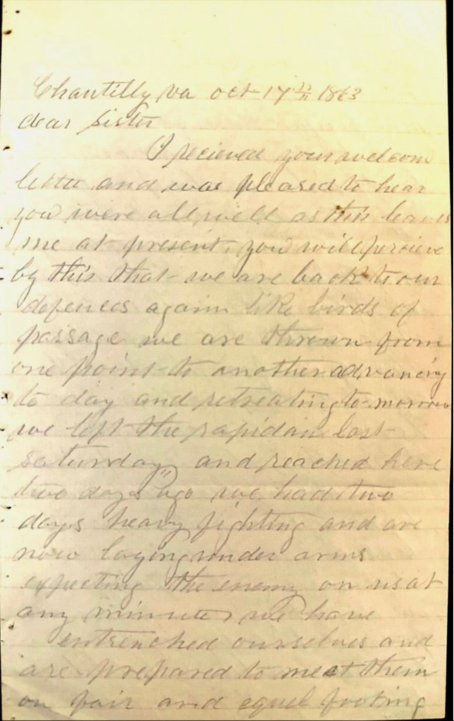 I received your welcome letter and was pleased to hear you were all well as this leaves me at present. You will perceive by this that we are back to our defenses again. Like birds of passage we are thrown from one point to another, advancing today and retreating tomorrow. We left the Rapidan last Saturday and reached here two days ago. We had two days heavy fighting and are now laying under arms expecting the enemy on us at any minute. We have entrenched ourselves and are prepared to meet them on fair and equal footing. There seems to be a fatality attached to this army. We have now fought them for two years and today we find ourselves back in our old position. There is a report that Lee is going to invade Maryland and Pennsylvania but I do not think he will undertake it at this late season of the year for should he be defeated the roads would be in such a condition as to make a retreat impossible.