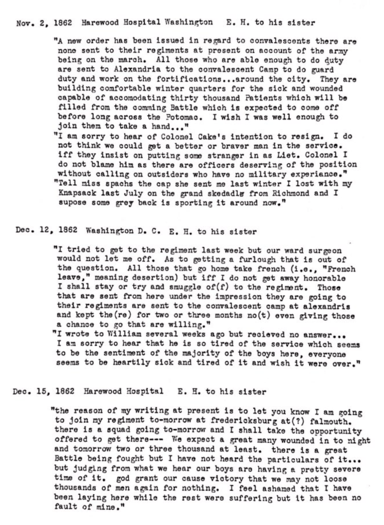control of Crampton’s Gap, Private Edward Henry was sent back to a hospital near Washington, suffering from what appears to have been some form of rheumatic fever, possibly contracted in the pestilential marshes of Harrison’s Landing. On September 17th–the bloodiest single day’s fighting of the entire war, with combined Union and Confederate casualties of 27,000 men–he wrote his sister a letter from his sickbed, passing along rumors of a Union victory in Maryland. Though his report of 15,000 captured Rebels proved wildly exaggerated—McClellan claimed about 6,000—the Maryland campaign was construed as a Union victory after Lee quietly withdrew his forces back across the Potomac the following day. From the many photographs of Harewood Hospital that survive, Henry’s description (Oct. 9, 1862) can be seen to have involved no empty reassurances—the place was large, clean, airy, and offered a degree of comfort and a standard of care exactly comparable to the best civilian hospitals of the period. Volunteer nurses flocked to these permanent hospitals from all over the Union; one of these, future authoress Louisa May Alcott, spent part of her nursing career at Harewood during this period and may well have been one of the “hundred ladies” mentioned in Henry’s letter of September 9th. Under the supervision of Dr. Jonathan Letterman, the North poured tremendous energies into the construction and expansion of those hospitals; by late 1864, Washington alone boasted two dozen of them.