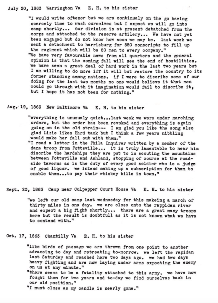 The spring and early summer of 1863 found the 96th Pennsylvania—now once again including Private Edward Henry—engaged in the hardest marching and fiercest fighting of its three-year term of service, struggling its way out of an ambush on Bowling Green Road at Chancellorsville and pushing back Rebel advances on Little Round Top at Gettysburg. After that battle, it joined the rest of Sixth Corps in pursuit during the second week of July, a pursuit that involved the crossing of Cotocin Mountain at night in the middle of a thunderstorm punctuated by burst of artillery fire from the rear-guard of Lee’s retreating army. Later that month, the regiment was detached to New Baltimore for routine picket duty, leaving there in mid- September to take part in Meade’s Rapidan Campaign—a series of hard marches and skirmishes between Chantilly and the Rapidan. Henry’s letter of the 17th of October probably refers to the engagement at Bristoe Station on the 14th, in which two brigades under A. P. Hill were cut to pieces by three Union divisions under G. K. Warren, a miscalculation that earned Hill a stinging rebuke from Lee the next day, while Henry was “expecting the enemy on us any minute,” Lee was already moving his troops on a muddy march away from Chantilly, south along the railroad line to Brandy Station. The 96th finally went into camp for the winter at Aestham Creek near the banks of the Rappahannock.