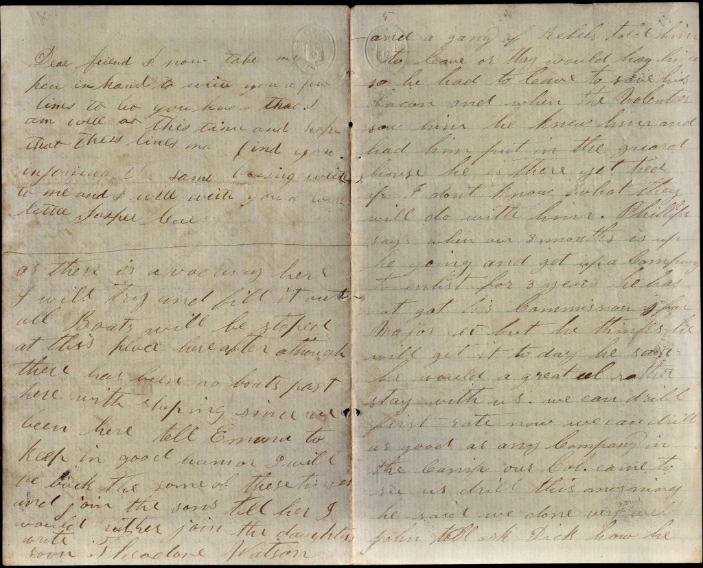 Well, John, I have are my dinner and feel very much refreshed. I drank about a pint and a half of coffee. You said you heard the Ohio was poisonous. There is nothing of it. There was a man taken here yesterday as a spy. One of the volunteers in our camp was acquainted with him in Kentucky. The volunteer said he was living in Kentucky when this spy and a gang of rebels told him to leave or they would hang him so he had to leave to save his bacon and when the volunteer saw him, he knew him and had him put in the guard house. He is there yet, tied up. I don’t know what they will do with him. Phillips says when our three months is up, he is going and get up a company to enlist for three years. He has not got his commission for Major yet but he thinks he will get it today. He says he would a great deal rather stay with us. We can drill first rate now. We can drill as good as any company in the camp. Our Colonel came to see us drill this morning. He said we done very well.