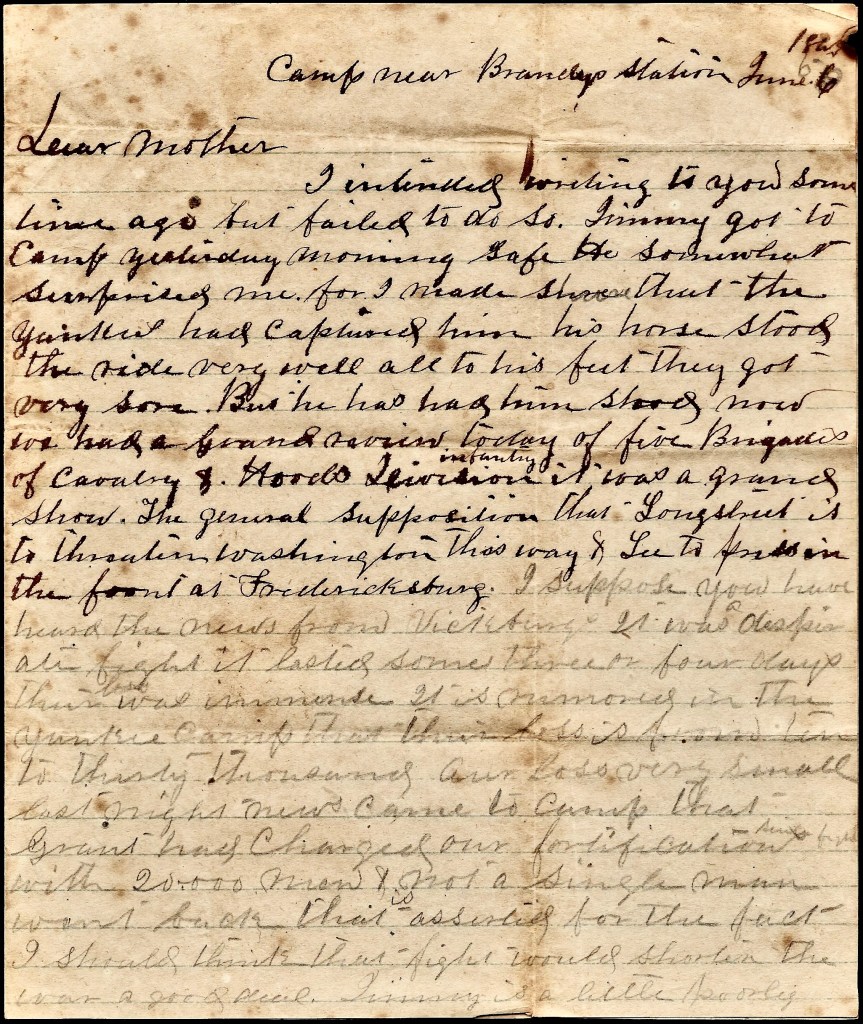 Henry’s letter was datelined from Culpeper, Virginia, where the men and horses were recruiting from their long campaign into Pennsylvania and back. Referring to the Gettysburg Campaign, Henry wrote: “Annie, you say if we were not whipped in Pennsylvania, we did not make [achieve] anything by going over there, but we done them so bad that they would not attack us when we waited for them three days at Hagerstown. Meade has tried to get them to come over here, but he can’t get them to come over. They say they won’t come over here to be murdered, so you may know that a burnt child dreads the fire.”