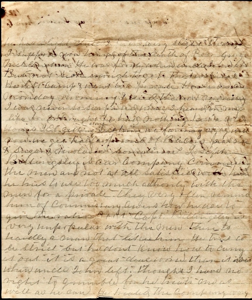 Joseph Billingsley is our company commissary. The men are not at all satisfied with him. He tries to use too much authority with the men for a private. They very often remind him of Commissary [John E.] Owens [and] how he use to give the rations out. Capt. Billingsley is very unpopular with the men then too. Hardly a man that likes him. He tries to be strict but he don’t know how to carry it out. It is a great deal worse than it was when Uncle John left though I have no right to grumble for he treats me as well as he can. He treated the company very badly about the election of officers. Bob Coakley has been elected Jr. Second Lieutenant & because would not select Phil Peed, he had him appointed ahead of Bob Coakley. The company is very much dissatisfied. We had the right to elect our officers and we wanted to use it. The company to a man wanted Jim McKinny. Billlingsley kicked up a fuss about Coakley being elected. He didn’t want. I am sure he is a religious, moral man. He got 3/4 of the votes.