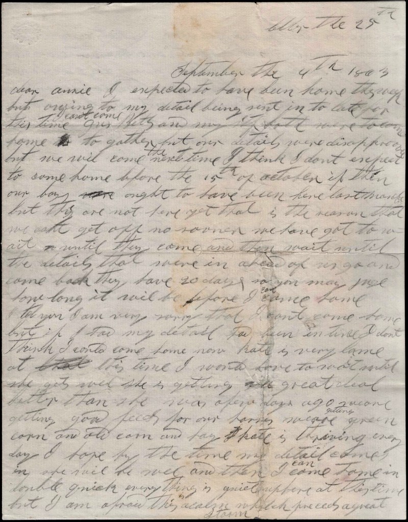 Dear Annie, I expected to have been home this week but owing to my detail being sent in too late for this time, can’t come. Gus Betts and myself both were to come home together, but our details were disapproved, but we will come the next time I think. I don’t expect to come home before the 15th of October, if then. Our boys ought to have been here last Monday but they are not here yet. That is the reason that we can’t get off no sooner We have got to wait until they come and then wait until the details that were in ahead of us go and come back. They have 20 days so you may judge how long it will be before I can come home. I tell you, I am very sorry that I can’t come home, but [even] if my detail had been in time, I don’t think I could come home now. [My horse] Kate is very lame at this time. I would have to wait until she gets well. She is getting a great deal better than she was a few days ago. We are getting good feed for our horses. We are getting green corn and old corn and hay. Kate is thriving every day. I hope by the time my detail cones in, she will be well, and then I can come home in double quick time.