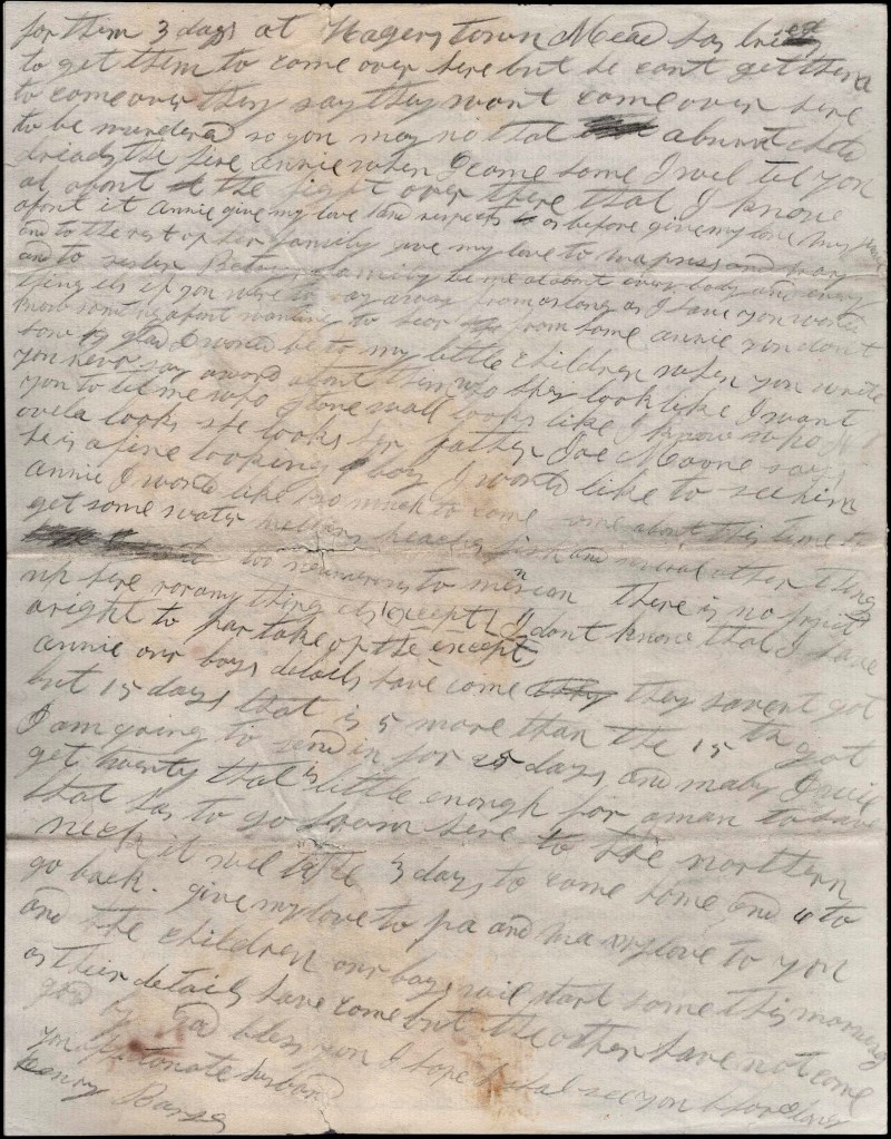 Annie, when I come home, I will tell you all about the fight over there—[all] that I know about it. Give my love and respects to the rest of the family. Give my love to Ma [ ] and to sister Betsy’s family. Tell me all about everybody and everything else… Annie, you don’t know how glad I would be to see my little children. When you write, you never say a word about them. Who do they look Like? I want you to tell me who Stonewall looks like. I know who Novella looks like. She looks like her father. Joe Moone says Stonewall is a fine looking boy. I would like to see him.
