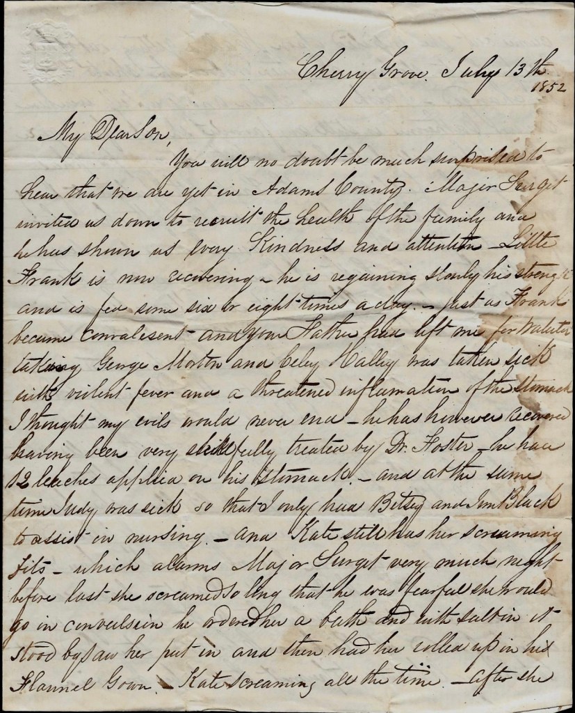 Tuesday 12 o’clock. Your plows finished the field next to my second year’s land. After dinner they will go into the piece adjoining the first. The hoe’s chopped over the second piece. The old ground is yet too wet to go into. Your corn is shooting very finely but the crows are injuring it already. All the hands are out today. Three laid up yesterday—Libby, Priss and Parthenia—who I think had chills. Directed Hoages to give quinine today and tomorrow. I saw blooms in my long [ ] today for the first time. The weather seems more settled and we shall have a great many in three or four days. Mother’s poultry are doing very well. No deaths in that line except the old gobbler which died the day after you left. Your son, — Thos. Henry