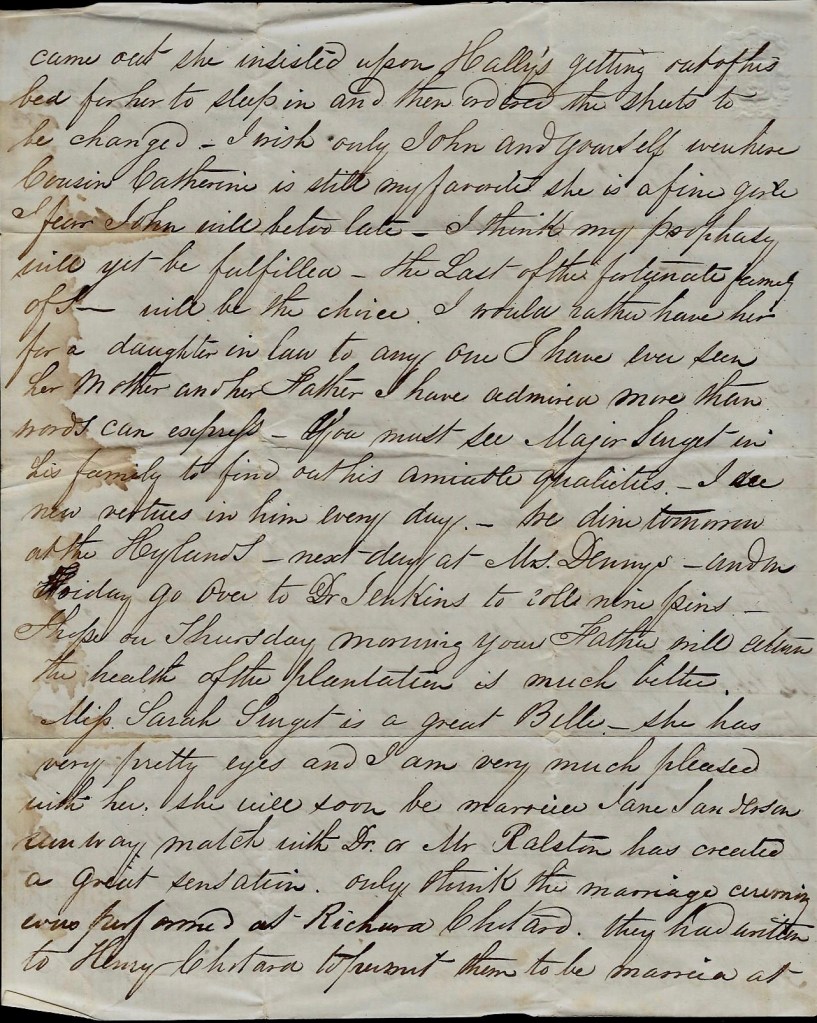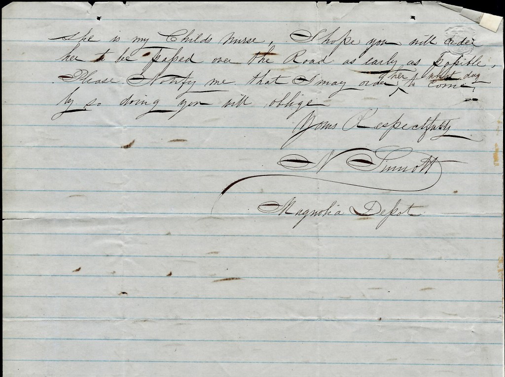 This letter was written by Thomas Henry McNeill (1821-1866), the son of Malcom McNeill (1796-1875) and Martha Rivers. Malcom McNeill began accumulating property in Kentucky where he relocated in 1817, and later bought thousands of acres in Mississippi and within the city of Natchez, which greatly increased in value. An 1884 history of Christian and Trigg counties as “perhaps the richest man in the county, with a large estate and many negroes both there and in Mississippi.”