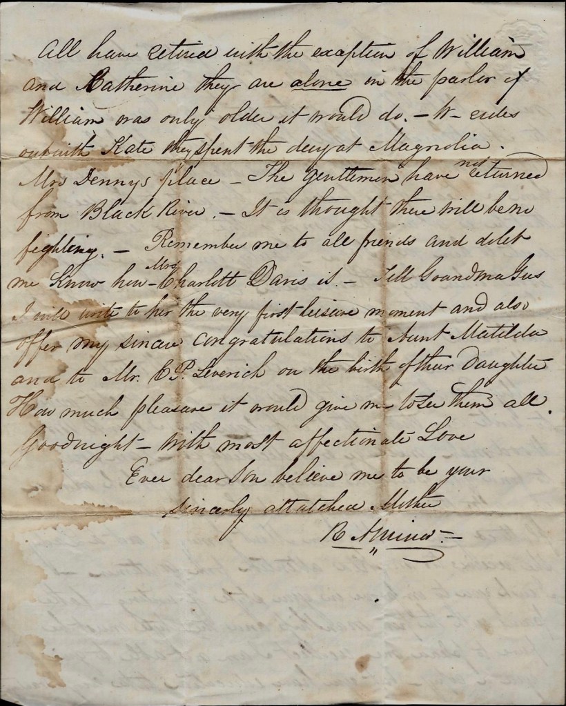 This letter will be dropped at Line Port by the Steamer Talleyrand. I will leave it open until she arrives. Your negroes (except Harick) are all well, but showing considerable disposition to lay up, or in other words, to possum.