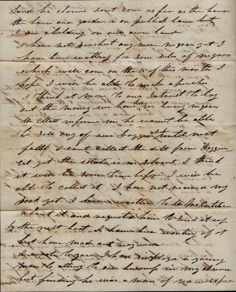 As we had to put Clark to getting boards, I made a plower of Gabriel who does very well in old land. He has never attempred to plow in the new ground so we are only running fourteen plows. I cannot say what time I shall leave. Perhaps not at all. My health is not as good as when you left yet I am up and attending closely to our business. I am making an effort to get two hundred acres well cleared this summer.