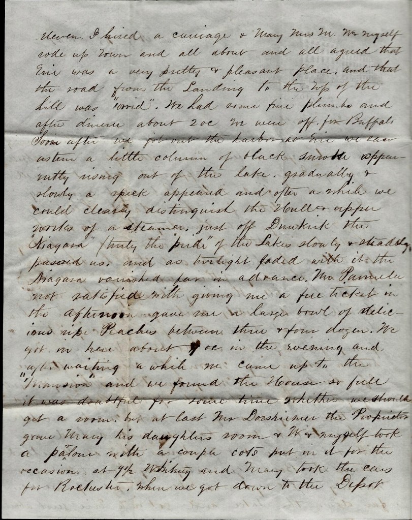 A graphic description of my journey will no doubt interest you. We had a charming moonlight evening after we left Sandusky and Mary, Mrs. Mills, Whitney & myself enjoyed it much. The clerk of the Buffalo would not take any fare of me but made me take a fare ticket as we had so good a load, we did not make but an hour’s stay at Cleveland whereas the boats generally lay there till next morning at 8 o’clock, 7 hours. When we got up we were far down the Lake and got into Erie [Pennsylvania] just about eleven. I hired a carriage & Mary, Mrs. Mills, Whitney & myself rode up town and all about and all agreed that Erie was a very pretty & pleasant place and that the road from the Landing to the top of the hill was “‘orrid”) We had some fine plums and after dinner about 2 o’clock we were off for Buffalo.