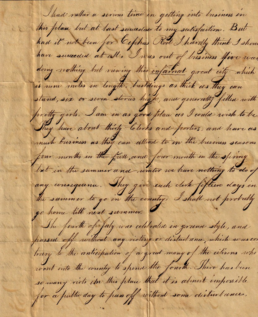 I had rather a serious time in getting into business in this place but at last succeeded to my satisfaction. But had it not been for Cephus Root, I hardly think I should have succeeded at all. I was out of business five weeks doing nothing but viewing the infernal great city which is nine miles in length, buildings as thick as they can stand, six or seven stories high, and generally filled with pretty girls. I am in as good place as I could wish to be. There have about thirty clerks and porters and have as much business as they can attend to in the business seasons four months in the fall and four months in the spring, but the summer and winter, we have nothing to do of any consequence. They give each clerk fifteen days in the summer to go in the country. I shall not probably go home till next summer.