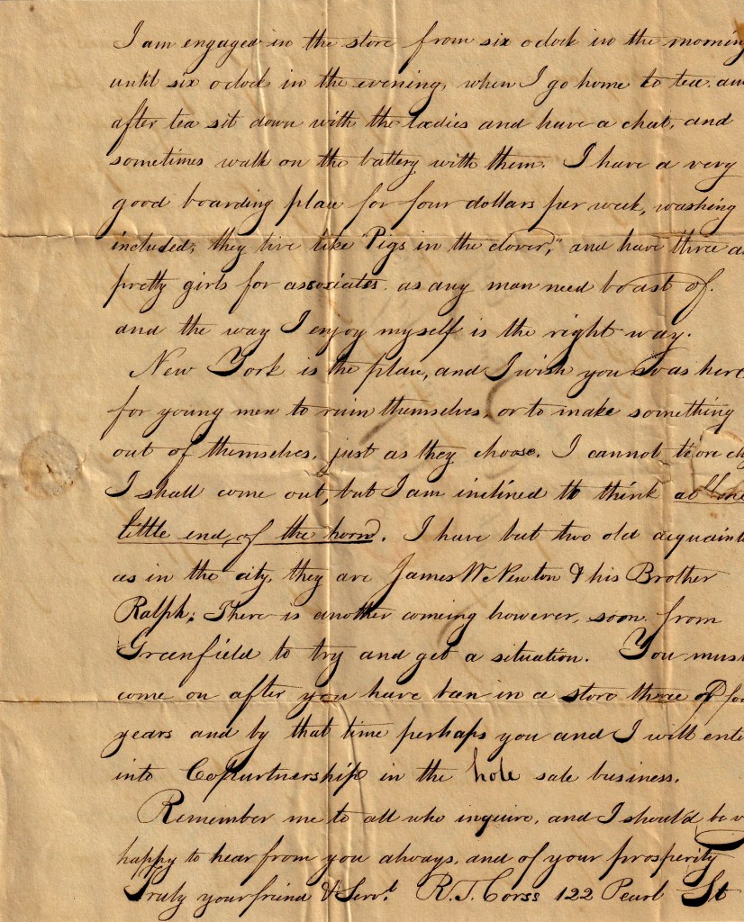 New York is the place, and I wish you was here for young men to ruin themselves, or to make something out of themselves, just as they choose. I cannot [say how] I shall come out, but I am inclined to think at the little end of the horn. I have but two old acquaintances in the city. They are James W. Newton and his brother Ralph. There is another coming, however, soon from Greenfield to try and get a situation. You must come on after you have been in a store three or four years and by that time perhaps you and I will enter into copartnership in the wholesale business.