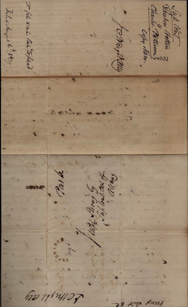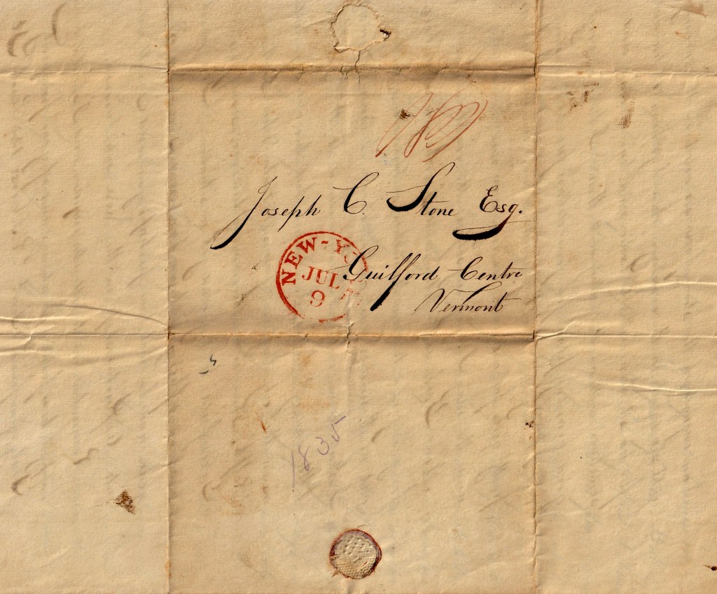 This is a wonderful handwritten letter, written on 8 July 1835, by 17 year-old Robert Thomas Corss (1818-1879), who had recently moved to New York to seek his fortune. He wrote the letter to Joseph C. Stone, an acquaintance who lived in Guilford Centre, Vermont. This articulate and tongue-in-cheek letter is of a philsophical nature, regarding how NYC is a place where young, hardworking people can become successful: ” New York is the place…for young men to ruin themselves or to make something out of themselves, just as they choose…” Corss also relates the ongong riots on the (politics, abolition, etc) which raged at the time. He also details what life was like for a young man at the time; long work hours—but still time to have fun. The address leaf has the applicable red postal mark of New York City.