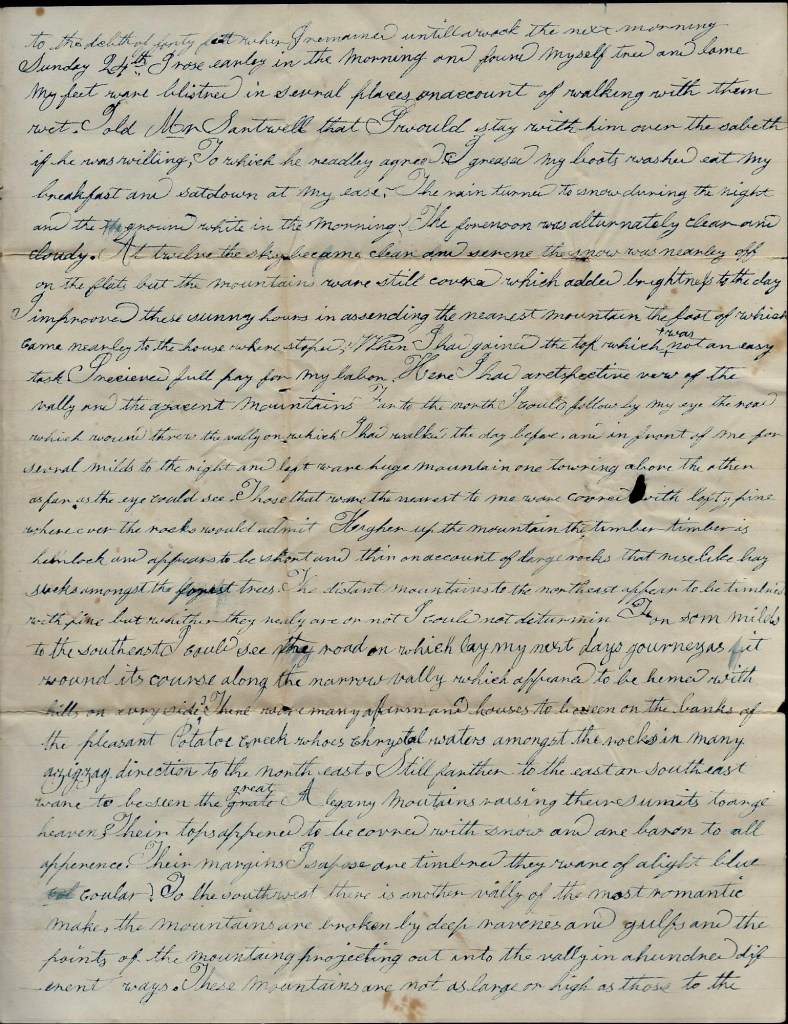I improved these sunny hours in ascending the nearest mountain by foot of which came nearly to the house where it stopped. When I had gained the top which was not an easy task, I received full pay for my labor. Here I had a retrospective view of the valley and the adjacent mountains. Far to the north, I could follow by my eyes the road which wound through the valley on which I had walked the day before, and in front of me for several miles to the right and left were huge mountains, one towering above the other as far as the eye could see. Those that were the nearest to me were covered with lofty pines wherever the rocks would admit. Higher up the mountain the timber is hemlock and appears to be short and thin on account of large rocks that were like hay stacks amongst the forest trees. The distant mountains to the northeast appear to be timbered with pine but whether they nearly are or not, I could not determine. For some miles to the southeast I could see the road on which lay my next days journey as it wound its course along the narrow valley which appeared to be hemmed with hills on every side. There were many a farm and houses to be seen on the banks of the pleasant Potato Creek whose crystal waters amongst the rocks in many a zigzagging direction to the northeast. Still farther to the east or southeast were to be seen the great Allegheny Mountains raising their summits to angel heavens. Their tops appeared to be covered with snow and are barren to all appearances. Their margins I suppose are timbered. They were of a light blue color. To the southwest there is another valley of the most romantic make. The mountains are broken by deep ravines and gulfs and the pits of the mountains projecting out into the valley in a hundred different ways. These mountains are not as large or high as those to the west or north, which are nothing in comparison to the mountains to the east and southeast. But they are so broken and rocky that they make a more wild and romantic scene.