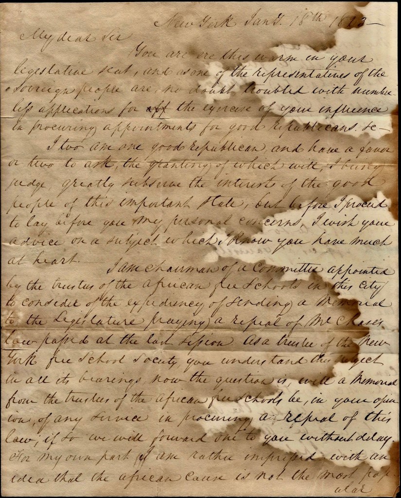 I am chairman of a committee appointed by the trustees of the African Free Schools in this city to consider of the expediency of sending a memorial to the Legislature praying a repeal of Mr. Chase’s law passed at the last session. As a trustee of the New York Free School Society, you understand this subject in all its bearings. Now the question is, will a Memorial from the trustees of the African Free Schools be, in your opinion, of any service in procuring a repeal of this law; if som we will forward one to you without delay. For my own part, I am rather impressed with an idea that the African cause is not the most popular at the Capitol at the present time. My conjecture, however, may be erroneous. You will be able to judge upon this subject with more certainty. I submitted my views on the subject of Chase’s law to my friend Mr. Gardiner before he left.