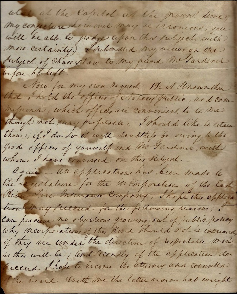 Now for my own request. Be it known then that I hold the offices of Notary Public, and Commissioner, which offices are convenient to me though not very profitable. I should like to retain them; if I do so, it will doubtless be owing to the good offices of yourself and Mr. Gardiner, with whom I have conversed on the subject.