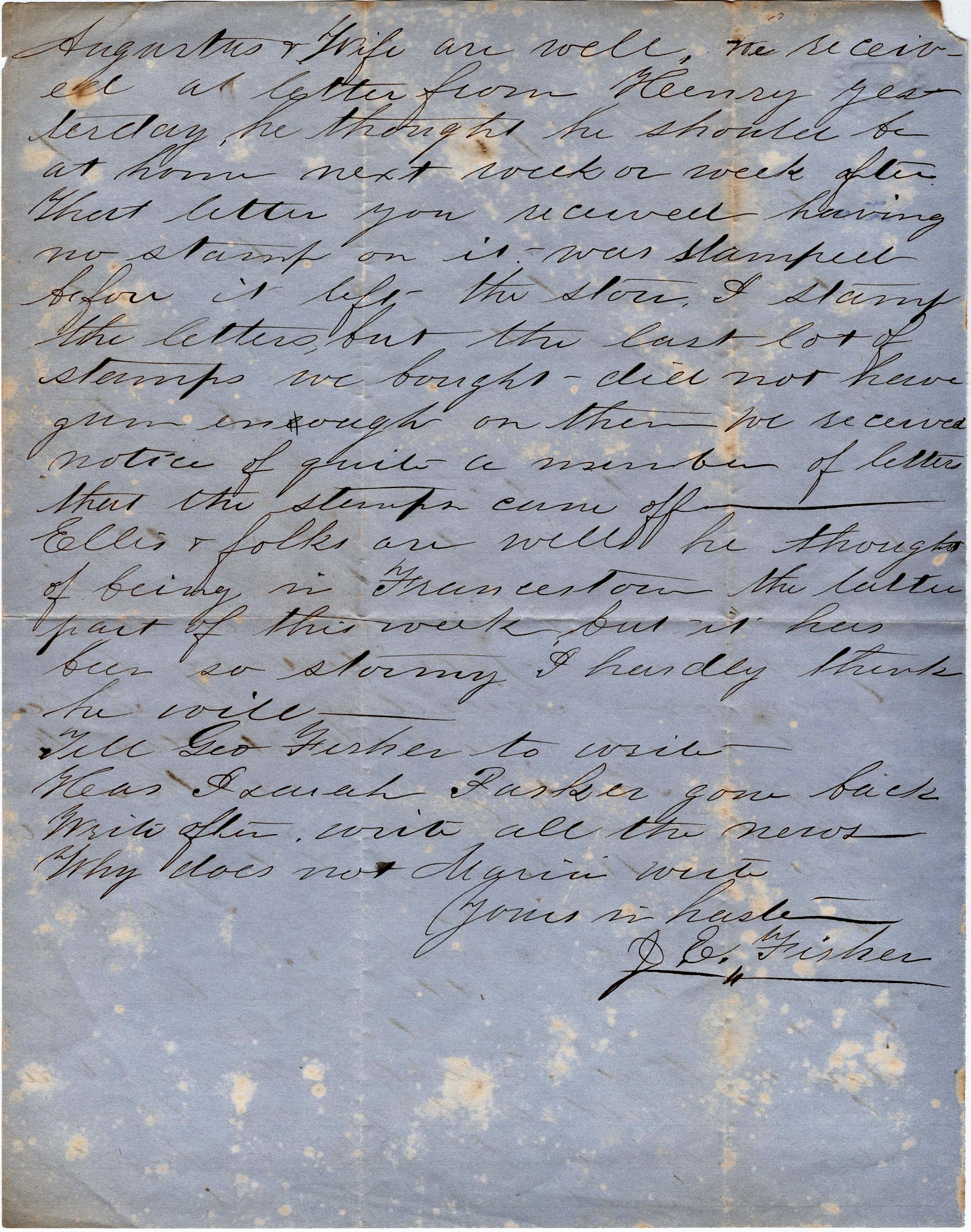 Ellis & folks are well. He thought of being in Francestown the latter part of this week but it has been so stormy I hardly think he will. Tell George Fisher to write. Has Isaiah Parker gone back? Write often. Write all the news. Why does not Maria write? Yours in haste. — J. E. Fisher