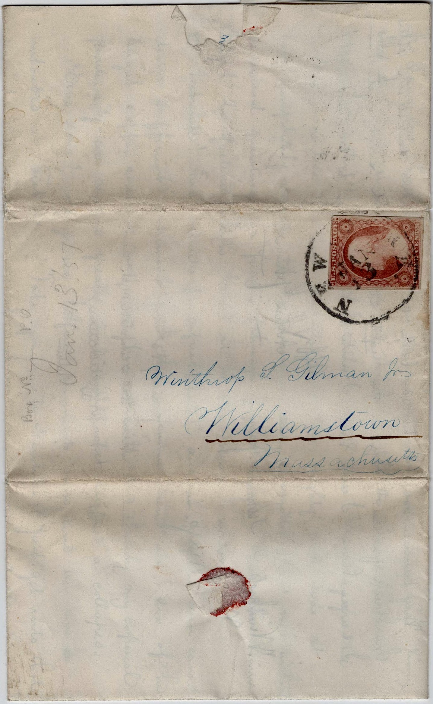 The following letter was written in January 1857 by Arthur Gilman (1837-1909), the son of Winthrop Sargent Gilman, Sr. (1808-1884) and Abia Swift Lippincott (1817-1902). He wrote the letter to his younger brother Winthrop (“Wint”) Sargent Gilman, Jr. (1839-1923) attending Williams College in Massachusetts.