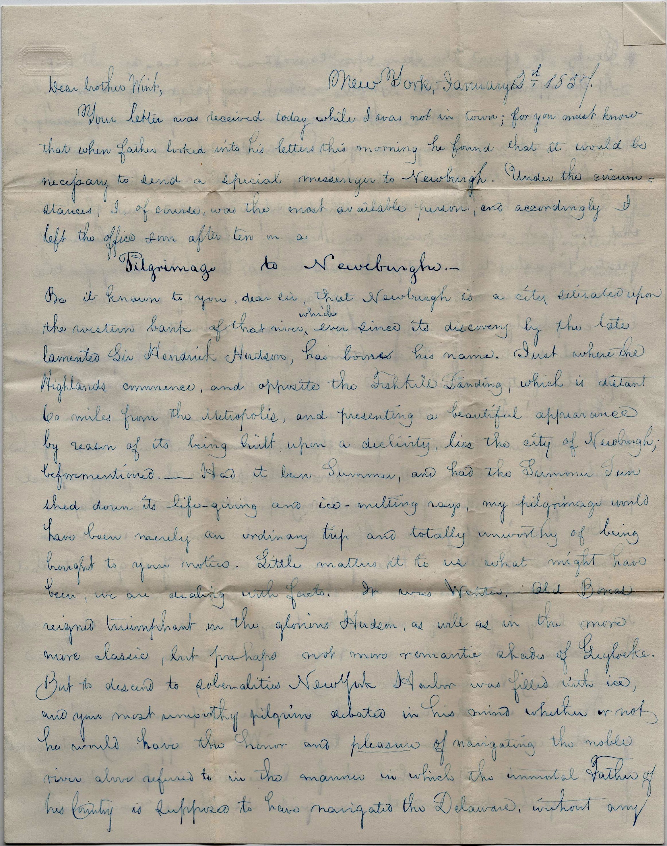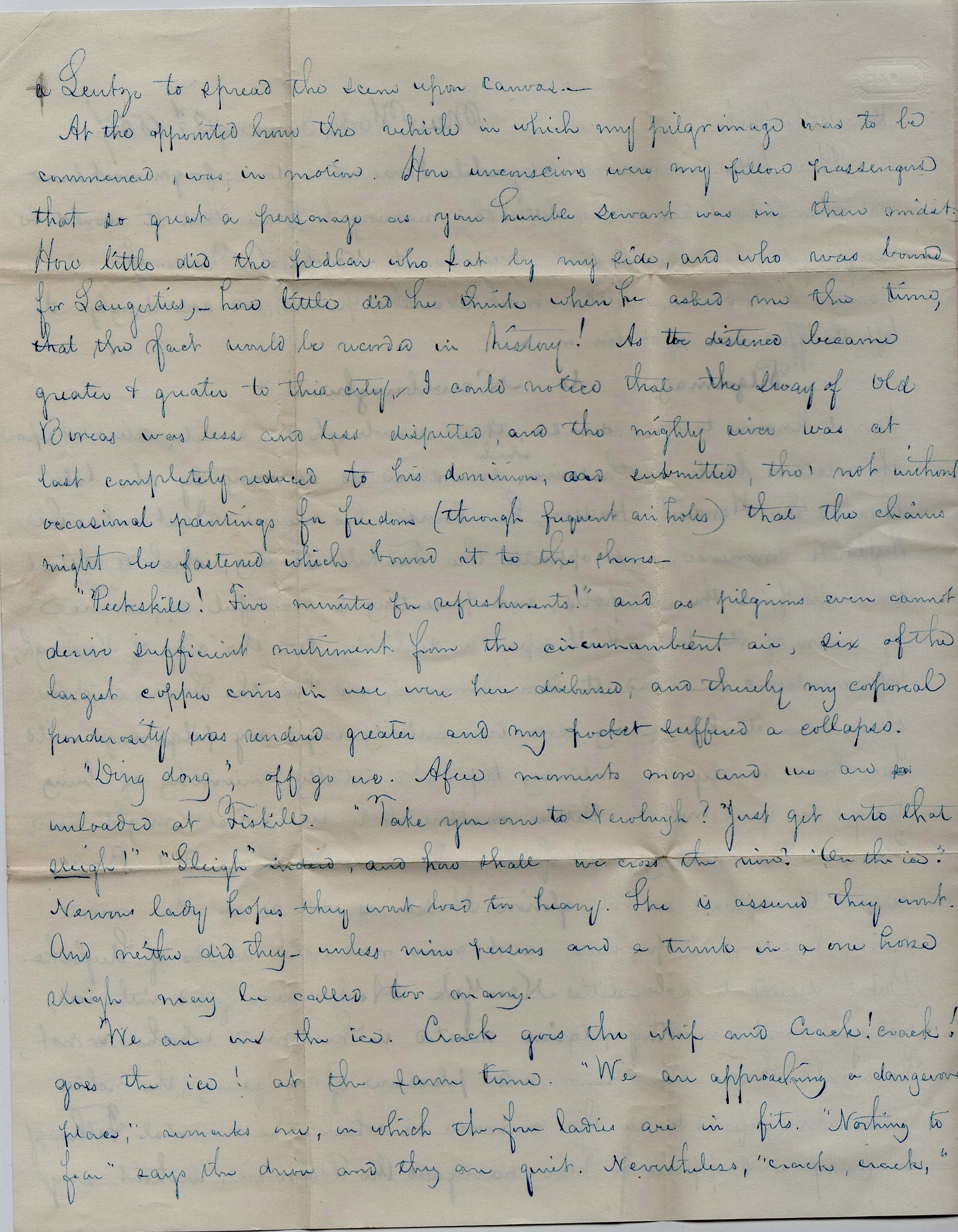At the appointed hour the vehicle in which my pilgrimage was to be commenced was in motion. How unconscious were my fellow passengers that so great a personage as your humble servant was in their midst. How little did the pedlar who sat by my side and who was bound for Saugerties,—how little did he think when he asked me the time that the fact would be recorded in history! As the distance became greater and greater to this city, I could notice that the sway of Old Boreas was less and less disputed and the mighty river was at last completely reduced to his dominion and submitted, tho’ not without occassional pantings for freedom (through frequent air holes) that the chains might be fastened which bound it to the shore.
